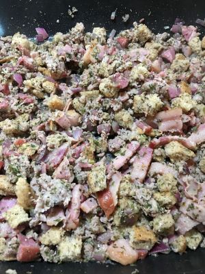 - Add poultry seasoning and bread cubes, mix to combine well.